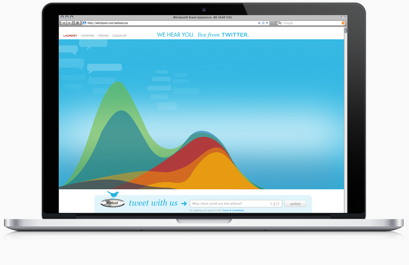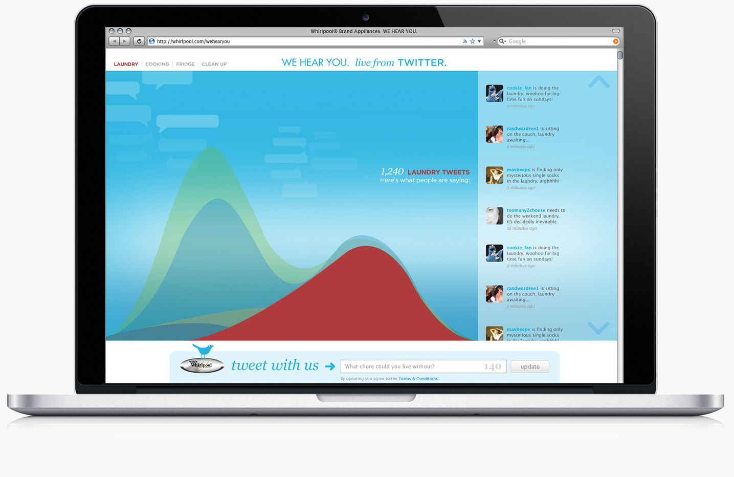 I had the opportunity to help Whirlpool come up with a new campaign a few years back. My team came up with the concept “We hear you” and I couldn’t think of a better way for consumers to interact with a brand better than using the Twitter platform. The idea was that we could search for particular hashtags like #laundry, or #cooking, or other chores, and we could use the opportunity to engage consumers by tweeting them advice, tips or even assist them with real time customer service. We could also use this information to help develop better products, simply by knowing when people were using their appliances, how they were using them, and what challenges they face daily.